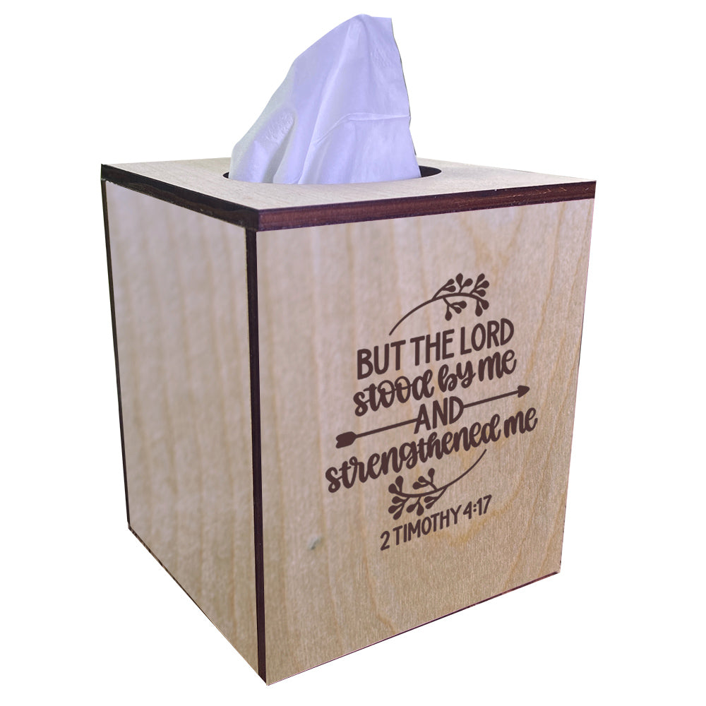 Introducing a beautifully crafted tissue cover made with high-quality 1/4-inch Birchwood. Engraved with a powerful message of strength and faith, it features the inspiring verse from 2 Timothy 4:17, “But the Lord stood by me and strengthened me”, serving as a constant reminder of the unwavering support and love that comes from above.
